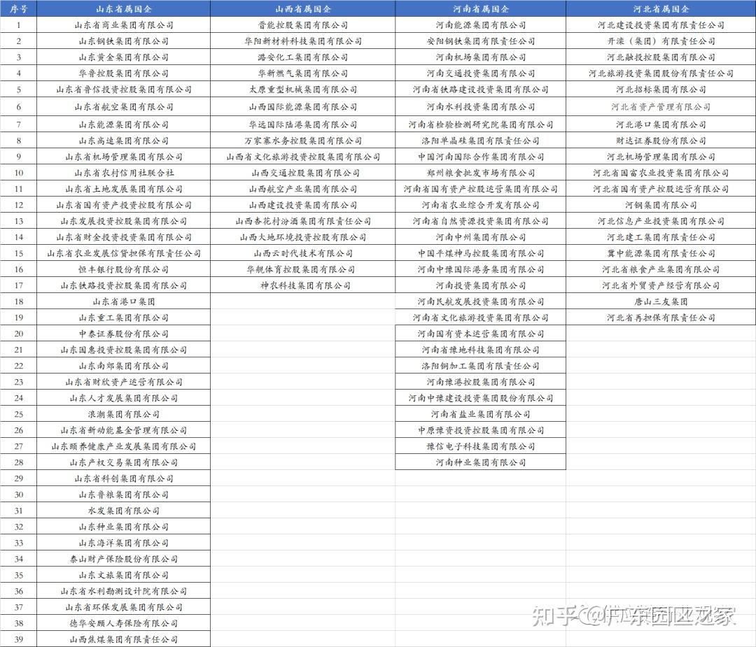 根據(jù)各地國(guó)資委披露的監(jiān)管企業(yè)名錄,山河四省共有省屬國(guó)企103家,數(shù)量上占全國(guó)比重的16%左右。其中,山東省屬國(guó)企38家、山西省屬國(guó)企18家,河南28家,19家。具體名錄如下,下表山西焦煤應(yīng)為山西省屬國(guó)企: