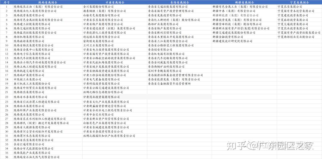 西北5省分別為陜西、甘肅、寧夏、新疆和青海。西北5省共擁有103家省級(jí)國(guó)企,其中陜西數(shù)量最多36家、甘肅31家、青海19家、新疆9家、寧夏8家。