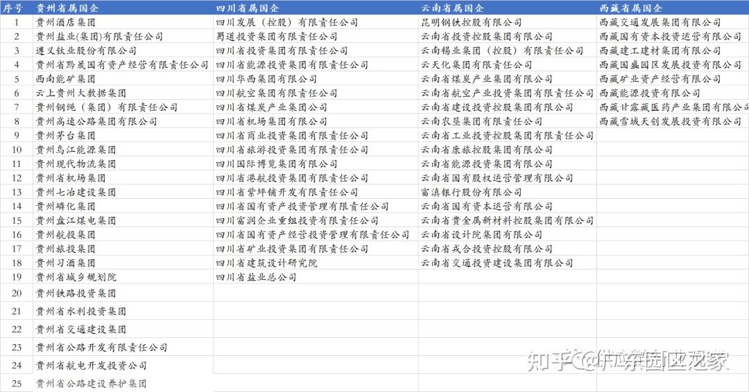 西南四省包括四川、云南、貴州和西藏,共70家省屬國(guó)企,其中四川省19家、貴州省25家、云南18家、西藏8家。