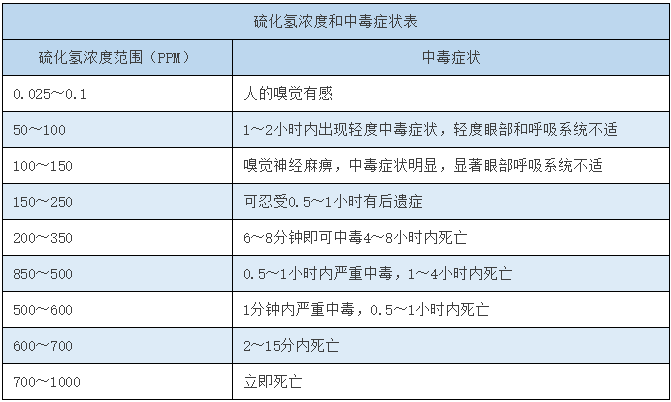 硫化氫能夠直接妨礙肌體對氧的攝取和運輸。從而造成細(xì)胞內(nèi)呼吸酶失去活力,造成細(xì)胞缺氧窒息死亡,硫化氫的毒性很強(qiáng),人的絕對致死濃度為1000毫克/米3。當(dāng)空氣中的硫化氫濃度為10~15ppm時使人們出現(xiàn)中毒癥狀,我國的工作場地環(huán)境最大允許濃度為10ppm。