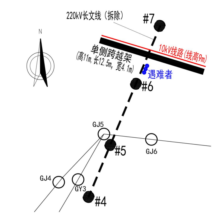 2023 年5月8日,施工項目部安排施工人員在原 220 千伏長文線 6-7 號桿塔間進(jìn)行10千伏夏屯線跨越架搭設(shè),因民事阻工僅在事故發(fā)生處南側(cè)搭設(shè)了單側(cè)跨越架。