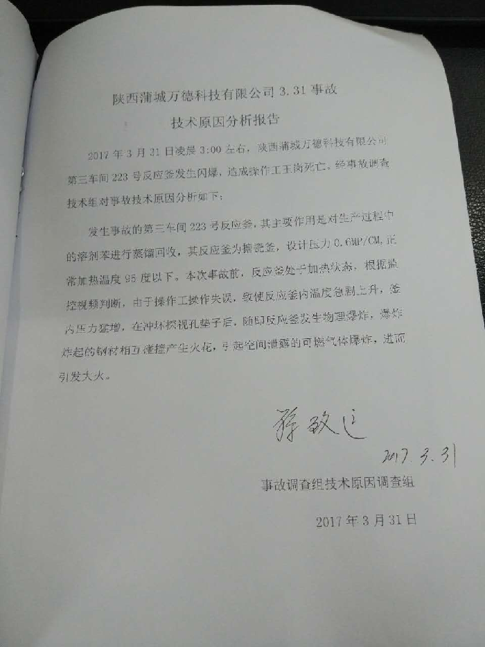 2017年3月31日凌晨3:00左右,蒲城萬(wàn)德科技有限公司第三車(chē)間223反應(yīng)釜發(fā)生閃爆,引發(fā)第三車(chē)間著火,造成一起1名夜班工人死亡。事故發(fā)生后,該公司值班領(lǐng)導(dǎo)向公司領(lǐng)導(dǎo)進(jìn)行了報(bào)告,該公司立即啟動(dòng)了《生產(chǎn)安全事故應(yīng)急救援預(yù)案》,組織工人啟動(dòng)消防水泵進(jìn)行現(xiàn)場(chǎng)救援,組織廠(chǎng)區(qū)其他工人撤出生產(chǎn)廠(chǎng)區(qū),同時(shí)向110、119、120請(qǐng)求救援,向相關(guān)政府部門(mén)進(jìn)行了報(bào)告。接到報(bào)告后,縣公安局陳莊派出所、安監(jiān)局、蒲城高新區(qū)管委會(huì)、消防大隊(duì)、120急救部門(mén)第一時(shí)間趕到現(xiàn)場(chǎng)進(jìn)行救援處置,凌晨4時(shí)20分左右成功撲滅事故現(xiàn)場(chǎng)明火。隨后該公司組織在第三車(chē)間二樓平臺(tái)找到王崗的尸體,證實(shí)該名工人在爆炸中當(dāng)場(chǎng)死亡。