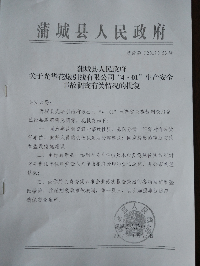 關(guān)于光華花炮引線有限公司“4.01”生產(chǎn)安全事故調(diào)查報告