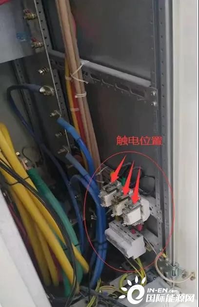 8月28日8點(diǎn)22分,王某帥(戴絕緣手套)完成本人負(fù)責(zé)的間隔電纜穿線并固定后,聽到隔壁柜發(fā)出聲響,檢查發(fā)現(xiàn)耿某坡(穿短袖上衣、未佩戴絕緣手套)身體倒進(jìn)灰?guī)霢段MCC柜01間隔,右臂肘部及上臂與該柜浪涌保護(hù)熔斷式保險(xiǎn)上插頭(裸露)三相搭接(現(xiàn)場(chǎng)照片見圖三)。王某帥立即通過拖拽耿某坡鞋子將其拉出間隔,并告知現(xiàn)場(chǎng)保安撥打120急救電話,同時(shí)進(jìn)行不間斷心肺復(fù)蘇,通知本隊(duì)伍經(jīng)理霍某平。