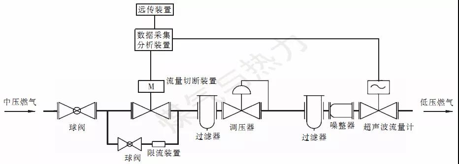 由于突發(fā)事故導(dǎo)致管道破損出現(xiàn)大量燃?xì)庑孤┖蟮陌l(fā)現(xiàn)、響應(yīng)及處理時(shí)間十分關(guān)鍵,快速辨別管道漏氣,第一時(shí)間進(jìn)行處置(如切斷上游供氣),可有效降低發(fā)生爆燃事故的風(fēng)險(xiǎn),尤其對(duì)于人口密集區(qū)域的庭院燃?xì)夤艿朗鹿侍幚砀又匾?。本?xiàng)目從管道出現(xiàn)較大泄漏產(chǎn)生流量異常作為切入點(diǎn)[1],重點(diǎn)研究解決兩個(gè)問(wèn)題:第一是對(duì)泄漏的智能判斷,通過(guò)對(duì)埋地庭院管網(wǎng)流量異常變化的捕捉及辨識(shí),對(duì)管道泄漏進(jìn)行辨識(shí)。第二是實(shí)時(shí)性問(wèn)題,及時(shí)發(fā)現(xiàn)泄漏后,快速報(bào)警、處置,縮短響應(yīng)時(shí)間。本項(xiàng)目考慮在燃?xì)庵械蛪和ピ喝細(xì)夤艿勒{(diào)壓箱處,安裝庭院燃?xì)夤艿佬孤﹫?bào)警切斷裝置解決上述問(wèn)題。該裝置主要由數(shù)據(jù)采集分析裝置、流量切斷裝置、遠(yuǎn)傳裝置、超聲波流量計(jì)、限流裝置以及球閥、過(guò)濾器、噪整器、太陽(yáng)能電池系統(tǒng)等組成,見(jiàn)圖1,太陽(yáng)能電池系統(tǒng)未畫(huà)于圖1內(nèi),其主要承擔(dān)數(shù)據(jù)采集分析裝置、遠(yuǎn)傳裝置運(yùn)行供電以及模塊間的通信供電。圖1 庭院燃?xì)夤艿佬孤﹫?bào)警切斷(限流)裝置組成