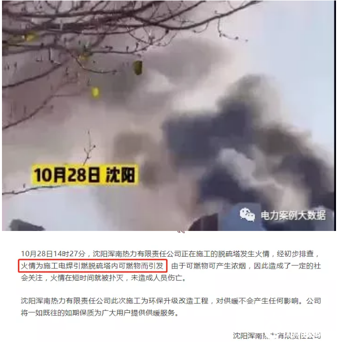 10月28日14時27分,沈陽渾南熱力有限責任公司正在施工的脫硫塔發(fā)生火情,經(jīng)初步排查,火情為施工電焊引燃脫硫塔內可燃物而引發(fā),由于可燃物可產(chǎn)生濃煙,因此造成了一定的社會關注,火情在短時間就被撲滅,未造成人員傷亡。