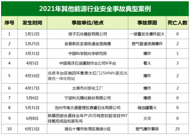 除電力、煤礦事故外,其他能源行業(yè)安全事故也時有發(fā)生。國際能源網(wǎng)記者總結(jié)了2021年典型能源安全事故發(fā)現(xiàn),其他能源行業(yè)安全事故多為火災(zāi)事故。天然氣、化工廠、儲能電站依然是火災(zāi)事故隱患較為集中的領(lǐng)域。因此,做好消防措施也是減少人員傷亡的有效手段之一。