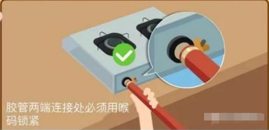 請使用專用燃?xì)饽z管,長度不超過2米、使用時(shí)間不得超過兩年、無老化破損的情況。膠管與氣瓶減壓閥、灶具、熱水器的接口處必須加裝管箍鎖緊,防止因膠管松動(dòng)出現(xiàn)煤氣泄漏。