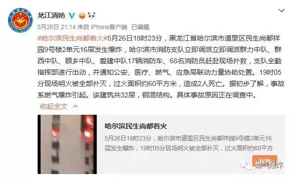 據(jù)@龍江消防:#哈爾濱民生尚都著火#5月26日18時23分,黑龍江省哈爾濱市道里區(qū)民生尚都祥園9號樓2單元16層發(fā)生爆炸,哈爾濱市消防支隊立即調(diào)派立即調(diào)派群力中隊、群西中隊、顧?quán)l(xiāng)中隊、愛建中隊17輛消防車、68名消防員趕赴現(xiàn)場撲救,支隊全勤指揮部遂行出動,并通知公安、醫(yī)療、燃?xì)?、?yīng)急局聯(lián)動力量協(xié)助處置。19時05分現(xiàn)場明火被全部撲滅,過火面積約60平方米,造成2人死亡。據(jù)初步了解,事故系燃?xì)獗ㄒ?。該建筑?2層,鋼混結(jié)構(gòu)。