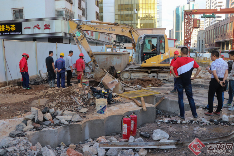 記者在現(xiàn)場(chǎng)看到,中鐵十八局、燃?xì)夤?、消防單位、交警單位、軌道公司等工作人員正在事發(fā)區(qū)域進(jìn)行搶修,一輛消防車(chē)停靠在施工圍擋墻外,一輛標(biāo)有昆明煤氣的搶修車(chē)輛及兩輛標(biāo)有云南中石油昆侖燃?xì)獾娜細(xì)鈸岆U(xiǎn)車(chē)輛停在施工區(qū)域內(nèi),另有一臺(tái)挖掘機(jī)正在作業(yè),一旁的交通信號(hào)燈已經(jīng)熄滅,交警在交叉口指揮疏導(dǎo)通行車(chē)輛。