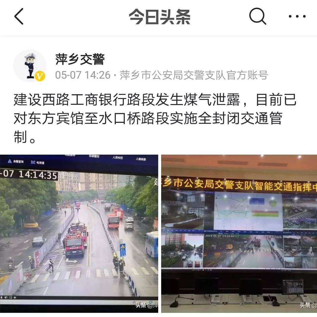 5月7日下午14時(shí)09分,萍鄉(xiāng)交警支隊(duì)指揮中心接到消防支隊(duì)119電話,在建設(shè)西路工商銀行路段發(fā)生天然氣泄漏事件,請(qǐng)求交警增援并實(shí)施路面交通管控。