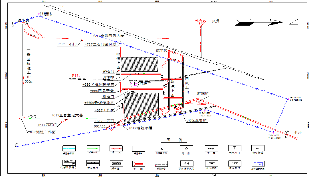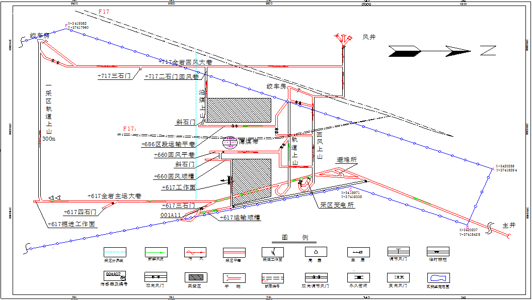 2.主要生產(chǎn)系統(tǒng)。礦井采用平硐上下山開拓,單水平布置。主平硐井口標高+612.73m,副井井口標高+761.70m,風井井口標高+758.94m。水平標高為+617m,劃分為4個采區(qū)。其中,+617m水平以上設(shè)置Ⅰ、Ⅱ2個采區(qū),+617m水平以下設(shè)置Ⅲ、Ⅳ2個采區(qū)(見圖1)。礦井主平硐采用CTY2.5-GGB型蓄電池電機車運輸;通風方式為中央邊界抽出式通風,風井安裝2臺FBCZ-6-№12防爆抽出式通風機,掘進工作面采用局部通風機供風;礦井為單回路供電,配備100KVA柴油發(fā)電機作為備用電源,電壓等級為660V。礦井現(xiàn)生產(chǎn)區(qū)域位于礦區(qū)中部F17斷層以南的Ⅰ采區(qū)。受斷層影響,Ⅰ采區(qū)北部呈一狹長塊段,礦井將該塊段劃分出來,作為邊角煤采區(qū)進行獨立回采,即+617m采煤工作面,礦井編制了《邊角煤采區(qū)設(shè)計》。