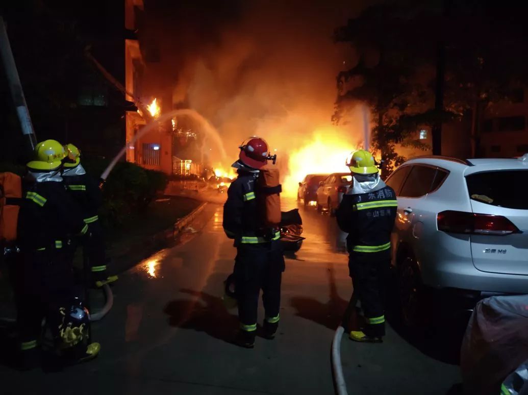 2時(shí)34分,中隊(duì)剛到場(chǎng),指揮員立即勘查現(xiàn)場(chǎng),小車(chē)已被大火吞噬,火災(zāi)已蔓延到附近的出租屋,有人員被困,聽(tīng)到有六七聲爆炸聲,并看到有氣瓶飛到河對(duì)面。
