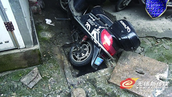 現(xiàn)場(chǎng)了解到,這次自行“跳躍”的窨井蓋數(shù)目不少,不過(guò)事故的動(dòng)靜不大,只有窨井蓋周圍有崩壞的痕跡,掉落下一些水泥塊,周圍并無(wú)燃燒跡象,也沒(méi)造成人員受傷。要說(shuō)最“嚴(yán)重”的,則是其中一個(gè)窨井旁停放的電動(dòng)車,被彈起的窨井蓋撞倒(見(jiàn)圖)。