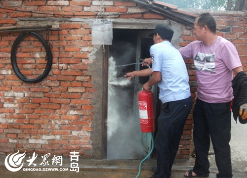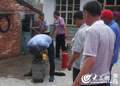 7月25日13時,黃島公安分局理務(wù)關(guān)派出所接到群眾報警,村民曲大娘在廚房給老伴煮綠豆湯時煤氣罐突然起火。接警后,理務(wù)關(guān)派出所民警立即趕到現(xiàn)場,發(fā)現(xiàn)煤氣罐在西屋廚房內(nèi),煤氣罐軟管接口脫落,接口處正在噴火,并且已經(jīng)引燃了附近的桌子,十分危險。民警迅速靠近火勢區(qū)域,頂著濃煙先將煤氣閥關(guān)閉,然后和附近群眾一起利用滅火器對廚房內(nèi)可燃物進行噴灑,并用打濕的衣物蓋在液化氣罐上對罐體進行冷卻,成功化解了險情。此時,曲大娘懸著的心也放了下來。