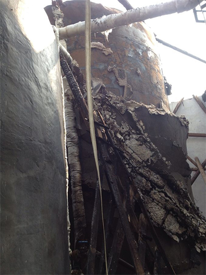 現(xiàn)場勘察發(fā)現(xiàn),3號罐輸送至1號罐的輸送管水平距離為10米,并用保溫材料進(jìn)行保溫。爆炸現(xiàn)場1號罐固定頂被炸飛,另兩只儲罐完好。爆炸的1號罐罐頂材質(zhì)為厚度5mm的鐵板,自制而成。內(nèi)壁較為粗糙,進(jìn)料口附近約50cm的范圍內(nèi)有熏黑的痕跡,未煙熏部分有鐵銹。罐頂設(shè)有人孔蓋和放空口,在人孔蓋附近無保溫材料,外壁有明顯燃燒的痕跡,人孔蓋與罐頂原有焊接縫處的焊接片脫落,說明罐頂外壁燃燒有一段時間。被結(jié)晶萘堵塞點(diǎn)位于1號罐罐頂進(jìn)料口水平距離約40cm,垂直距離約40cm,堵塞點(diǎn)與進(jìn)料口連接的法蘭已拆除;現(xiàn)場留有氣割槍等工具。